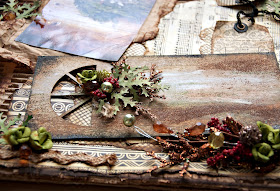 First I painted the door with streaks of Tim Holtz stains -picket fence, vintage photo and a little black soot in the corners. Then I used the Tim Holtz Distressed embossing powders in vintage photo, tea dye and black soot to accent the doors aged appearance.