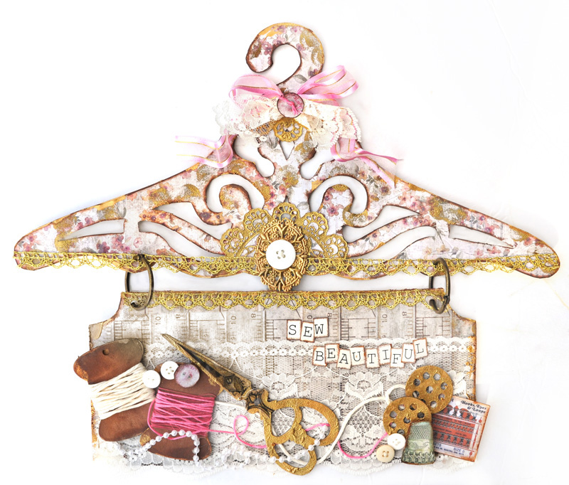 Using FabScraps Oh Sew Beautiful Collection Chipboard DC68001, cover the hanger using FabScraps Oh Sew Beautiful - Floral Pattern Paper C68002.